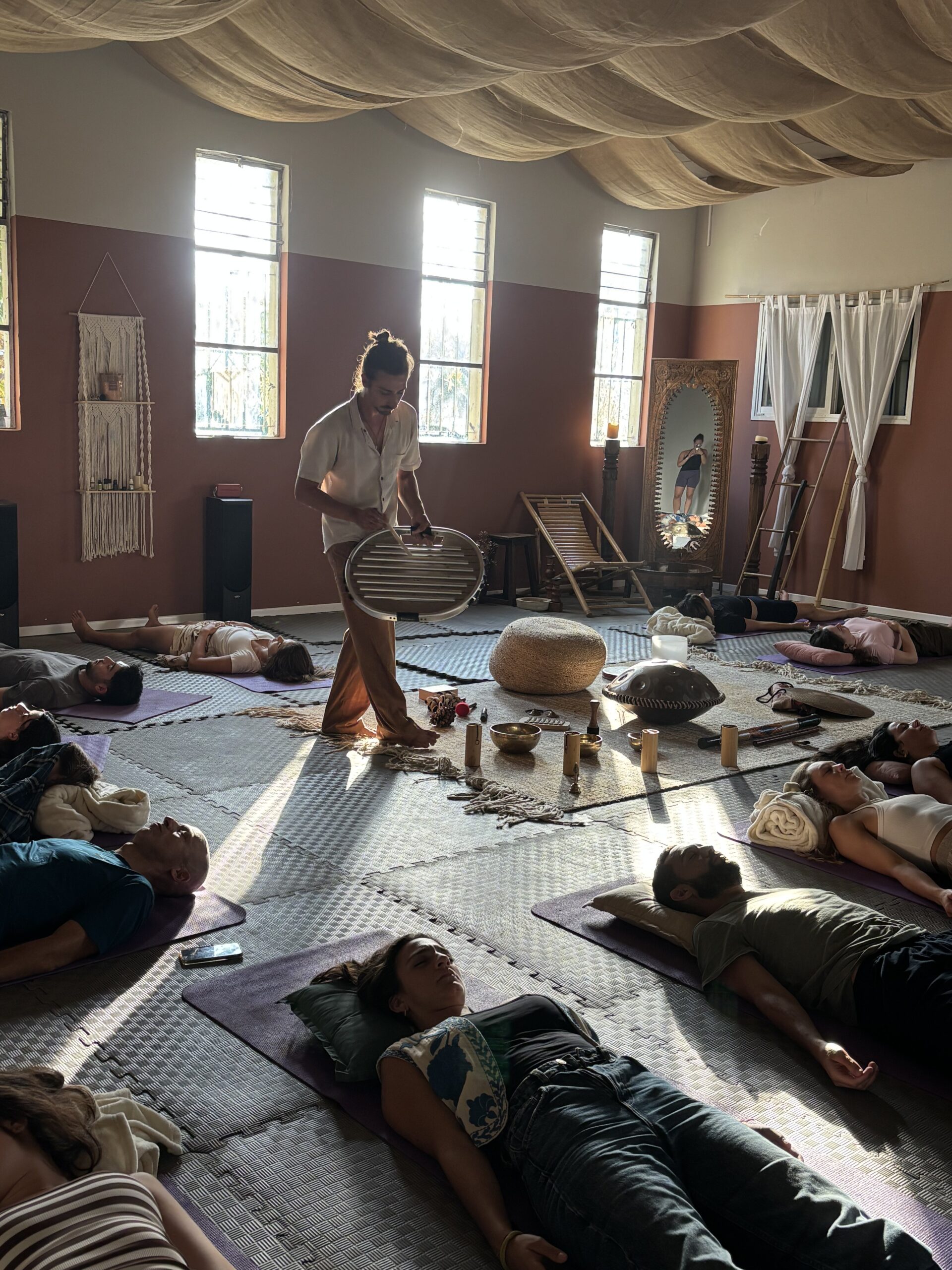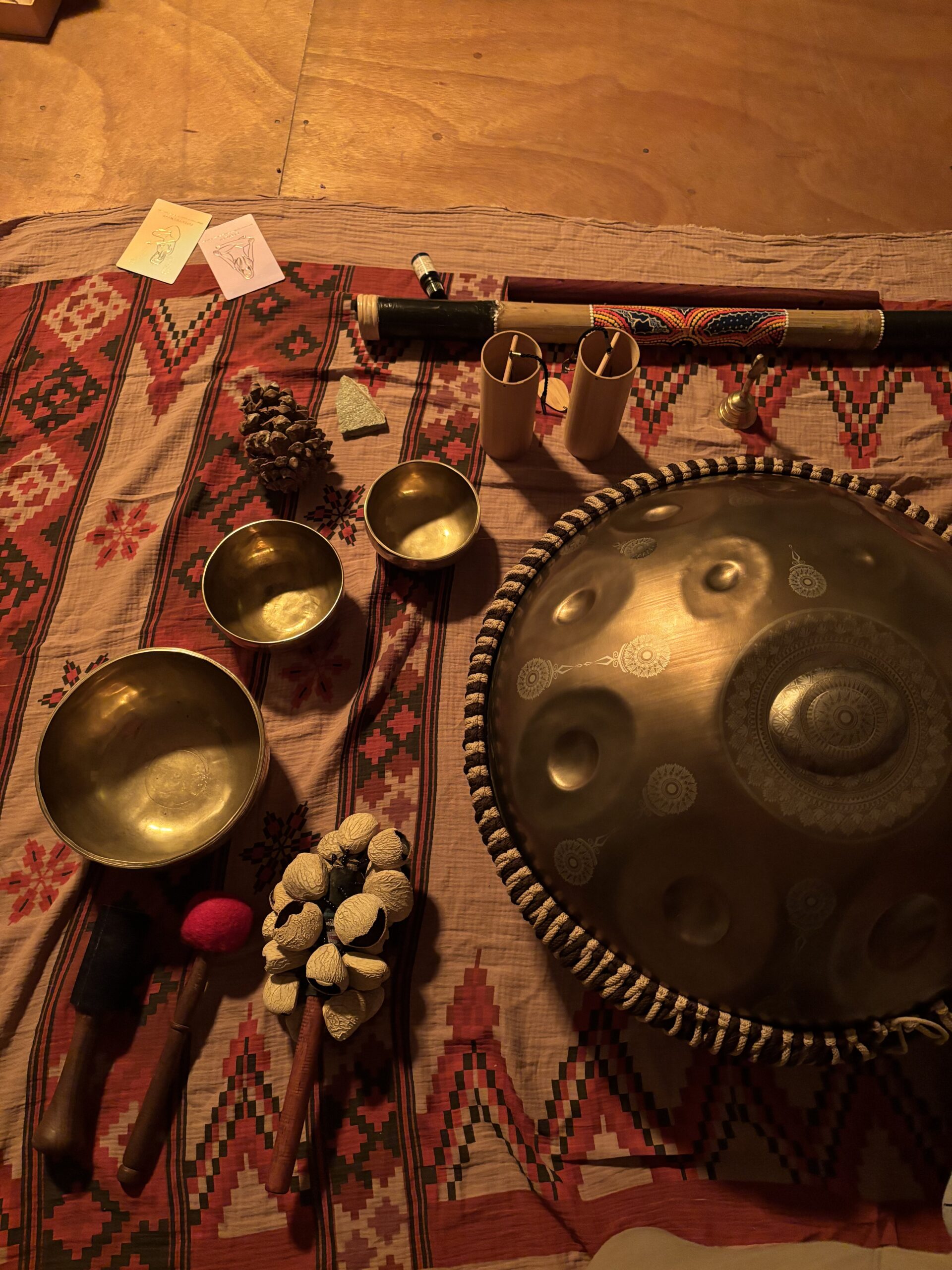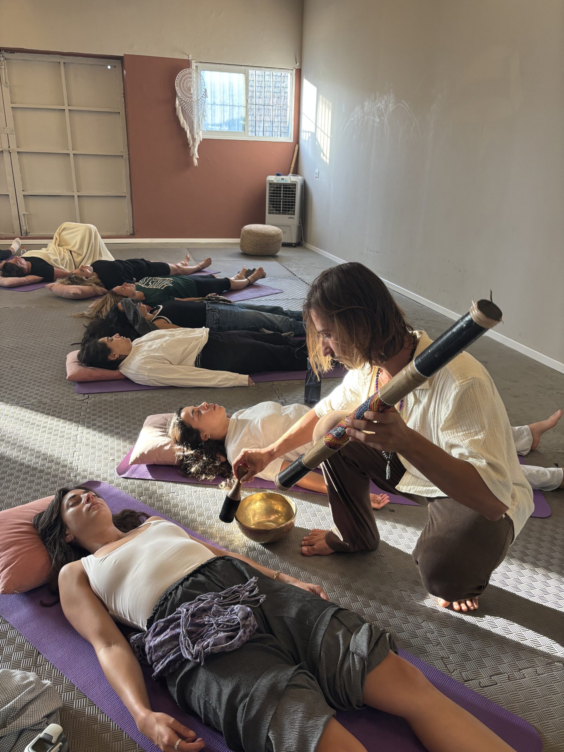 שעה של מסע סאונד הילינג טהור- 15 דק נשימות והרפייה, סריקה והנחייה למסע הצלילים, 45 דק של ניגון מרפא בשכיבה על הגב